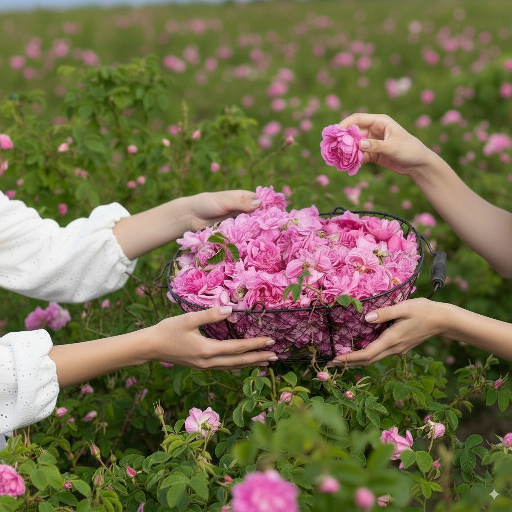 Each bottle is infused with Rosa Damascena oil, hand-harvested at dawn in Bulgaria’s Rose Valley. Its scent is delicate, authentic, and uplifting - never overpowering, always true to the flower.
